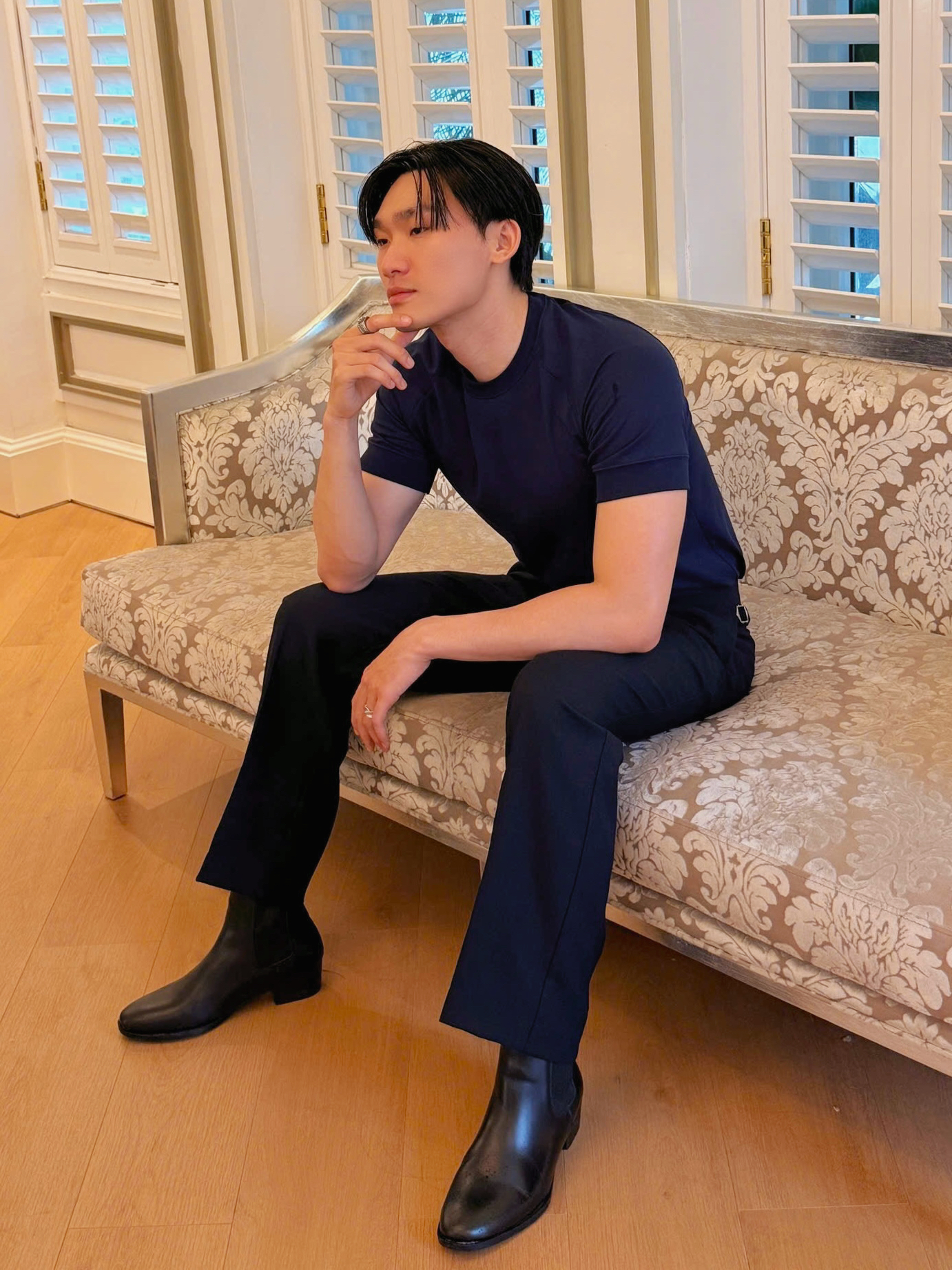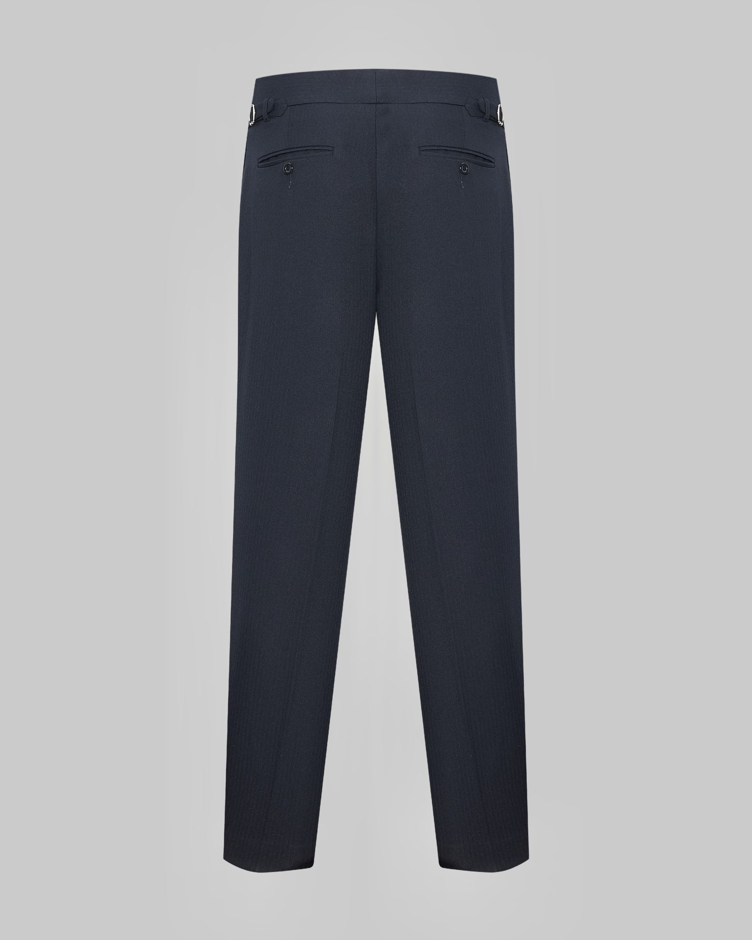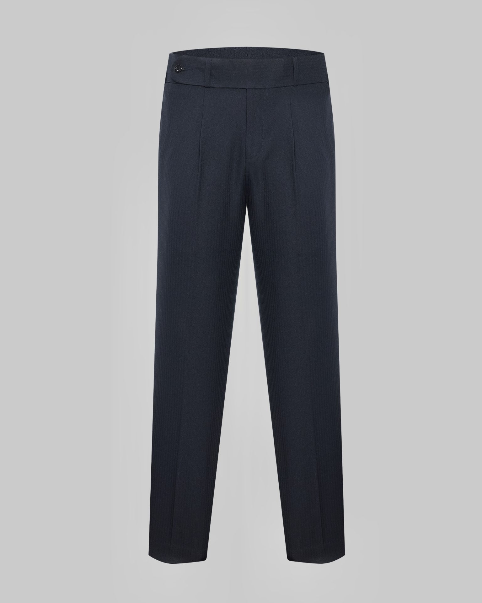 Quần tây đen dáng rộng vừa phải, cạp cao, có sidetab giúp siết vòng bụng. Thiết kế ly trước giúp form đứng, tôn dáng. Vải đen sọc chìm mờ mịn, ít nhăn, dễ phối từ áo thun đến sơ mi. Phù hợp phong cách classic & smart casual.